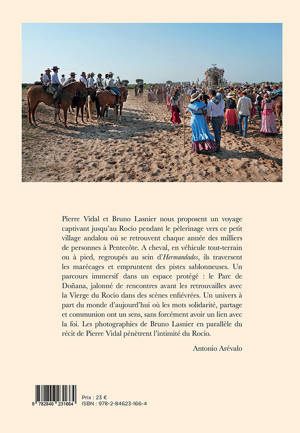 Un photographe Bruno Lasnier et un journaliste Pierre Vidal nous font découvrir l’Espagne profonde. Ils nous proposent un voyage captivant jusqu’au Rocío pendant le pèlerinage vers ce petit village andalou où se retrouvent chaque année des milliers de personnes à Pentecôte. A cheval, en véhicule tout-terrain ou à pied, regroupés au sein d’Hermandades, ils traversent les marécages et empruntent des pistes sablonneuses. Un parcours immersif dans un espace protégé : le Parc de Doñana, jalonné de rencontres avant les retrouvailles avec la Vierge du Rocío dans des scènes enfiévrées. Un univers à part du monde d’aujourd’hui où les mots solidarité, partage et communion ont un sens, sans forcément avoir un lien avec la foi. Les 56 photographies de Bruno Lasnier en parallèle du récit de Pierre Vidal pénètrent l’intimité du Rocío.