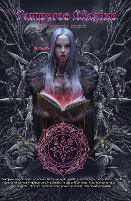 Vampyre Magick based on ancient Sumerian and Kemetic rituals, energy manipulation, remote influence, dreamwalking, incorporating entities, tulpas and servitors. Magnetic personality, laws of magnetic influence, awaken occult powers (siddhis). Non-blood vampirism. Many rituals, 178 pages.