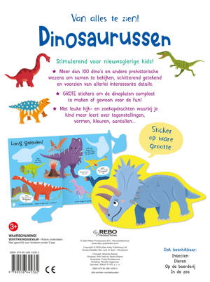 Stimulerend voor nieuwsgierige kids! Meer dan 100 dino's en andere prehistorische wezens om samen te bekijken, schitterend getekend en voorzien van allerlei interessante details. GROTE stickers om de dierenplaten compleet te maken of gewoon voor de fun! Met leuke kijk- en zoekopdrachten waarbij je kind meer leert over tegenstellingen, vormen, kleuren, aantallen...
