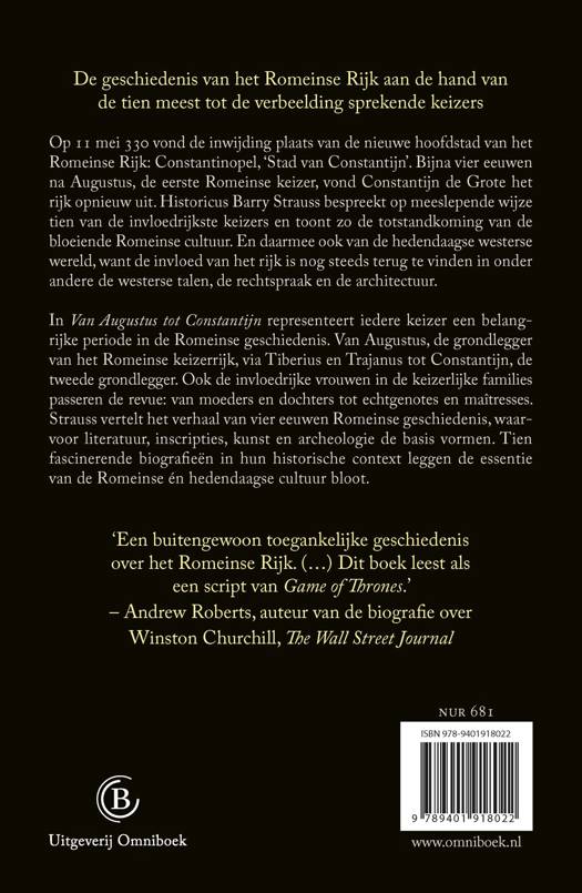 In 'Van Augustus tot Constantijn' vertelt Barry Strauss op toegankelijke wijze de complexe geschiedenis van Rome. Aan de hand van tien portretten van de meest tot de verbeelding sprekende figuur, de Romeinse keizer, brengt hij vier eeuwen geschiedenis tot leven. Alle tien keizers – Augustus, Tiberius, Nero, Vespasianus, Trajanus, Hadrianus, Marcus Aurelius, Septimus Severus, Diocletianus en Constantijn – representeren een belangrijke periode van het ooit zo machtige wereldrijk. Strauss maakt de geschiedenis van de klassieke oudheid daarmee behapbaar voor een breed publiek.