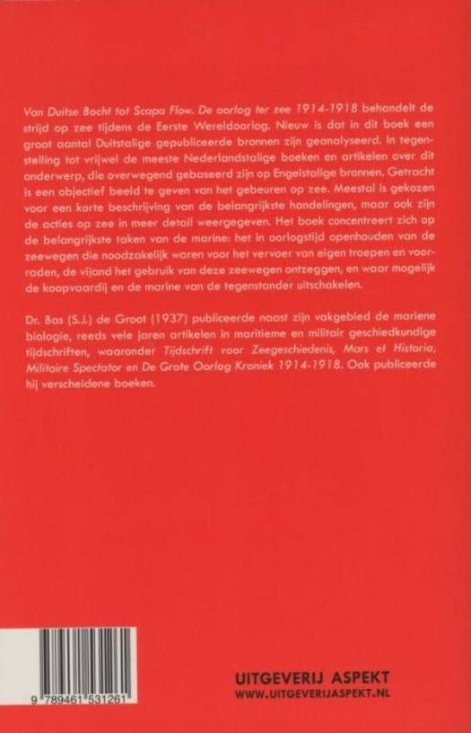 Van Duitse Bocht tot Scapa Flow. De oorlog ter zee 1914-1918 behandelt de strijd op zee tijdens de Eerste Wereldoorlog. Nieuw is dat in dit boek een groot aantal Duitstalige gepubliceerde bronnen zijn geanalyseerd. In tegenstelling tot vrijwel de meeste Nederlandstalige boeken en artikelen over dit onderwerp, die overwegend gebaseerd zijn op Engelstalige bronnen. Getracht is een objectief beeld te geven van het gebeuren op zee. Meestal is gekozen voor een korte beschrijving van de belangrijkste handelingen, maar ook zijn de acties op zee in meer detail weergegeven. Het boek concentreert zich op de belangrijkste taken van de marine: het in oorlogstijd openhouden van de zeewegen die noodzakelijk waren voor het vervoer van eigen troepen en voorraden, de vijand het gebruik van deze zeewegen ontzeggen, en waar mogelijk de koopvaardij en de marine van de tegenstander uitschakelen. Dr. Bas (S.J.) de Groot (1937) publiceerde naast zijn vakgebied de mariene biologie, reeds vele jaren artikelen in maritieme en militair geschiedkundige tijdschriften, waaronder Tijdschrift voor Zeegeschiedenis, Mars et Historia, Militaire Spectator en De Grote Oorlog Kroniek 1914-1918. Ook publiceerde hij verscheidene boeken.