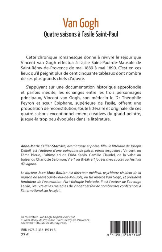 Cette chronique romanesque donne à revivre le séjour que Vincent van Gogh effectua à l’asile Saint-Paul-de-Mausole de Saint-Rémy-de-Provence de mai 1889 à mai 1890. C’est en ces lieux qu’il peignit plus de cent cinquante tableaux dont nombre de ses plus grands chefs-d’œuvre. S’appuyant sur une documentation historique approfondie et parfois inédite, les échanges entre les trois personnages principaux, Vincent van Gogh, son médecin le Dr Théophile Peyron et sœur Épiphane, supérieure de l’asile, offrent une proposition de reconstitution, toute littéraire et originale, de ces quatre saisons exceptionnellement créatives du grand peintre, jusque-là trop peu évoquées dans la littérature.