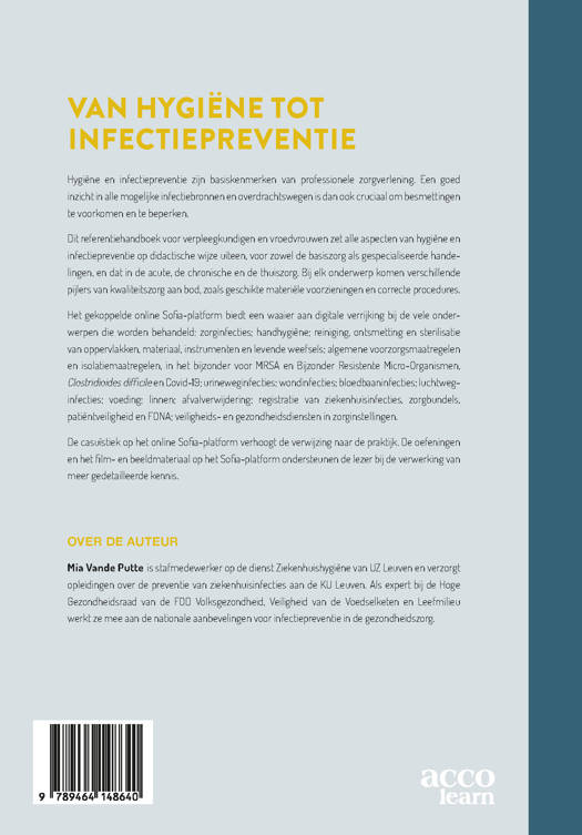 Hygiëne en infectiepreventie zijn basiskenmerken van professionele zorgverlening. Een goed inzicht in alle mogelijke infectiebronnen en overdrachtswegen is dan ook cruciaal om besmettingen te voorkomen en te beperken. Dit referentiehandboek voor verpleegkundigen en vroedvrouwen zet alle aspecten van hygiëne en infectiepreventie op didactische wijze uiteen, voor zowel de basiszorg als gespecialiseerde handelingen, en dat in de acute, de chronische en de thuiszorg. Bij elk onderwerp komen verschillende pijlers van kwaliteitszorg aan bod, zoals geschikte materiële voorzieningen en correcte procedures. Het gekoppelde online Sofia-platform biedt een waaier aan digitale verrijking bij de vele onderwerpen die worden behandeld: zorginfecties; handhygiëne; reiniging, ontsmetting en sterilisatie van oppervlakken, materiaal, instrumenten en levende weefsels; algemene voorzorgsmaatregelen en isolatiemaatregelen, in het bijzonder voor MRSA en Bijzonder Resistente Micro-Organismen, Clostridioides difficile en Covid-19; urineweginfecties; wondinfecties; bloedbaaninfecties; luchtweginfecties; voeding; linnen; afvalverwijdering; registratie van ziekenhuisinfecties, zorgbundels, patiëntveiligheid en FONA; veiligheids- en gezondheidsdiensten in zorginstellingen. De casuïstiek op het online Sofia-platform verhoogt de verwijzing naar de praktijk. De oefeningen en het film- en beeldmateriaal op het Sofia-platform ondersteunen de lezer bij de verwerking van meer gedetailleerde kennis.