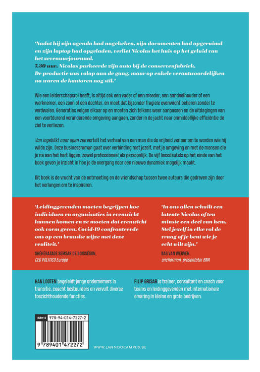 'Nadat hij zijn agenda had nagekeken, zijn documenten had opgeruimd en zijn laptop had opgeladen, verliet Nicolas het huis op het geluid van het zevenuurjournaal. 7.30 uur. Nicolas parkeerde zijn auto bij de conservenfabriek. De productie was volop aan de gang, maar op enkele verantwoordelijken na waren de kantoren nog stil.' Wie een leiderschapsrol heeft, is altijd ook een vader of een moeder, een aandeelhouder of een werknemer, een zoon of een dochter, en moet dat bijzonder fragiele evenwicht beheren zonder te verdwalen. Generaties volgen elkaar op en moeten zich telkens weer aanpassen en de uitdagingen van een voortdurend veranderende omgeving aangaan, zonder in de jacht naar onmiddellijke efficiëntie de ziel te verliezen. Van ingeblikt naar open zee vertelt het verhaal van een man die de vrijheid verloor om te worden wie hij wilde zijn. Deze businessroman gaat over verbinding met jezelf, met je omgeving en met de mensen die je na aan het hart liggen, zowel professioneel als persoonlijk. De vijf leessleutels op het einde van het boek geven je inzicht in hoe je de overgang naar een nieuwe dynamiek mogelijk maakt. Dit boek is de vrucht van de ontmoeting en de vriendschap tussen twee auteurs die gedreven zijn door het verlangen om te inspireren.
