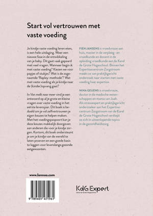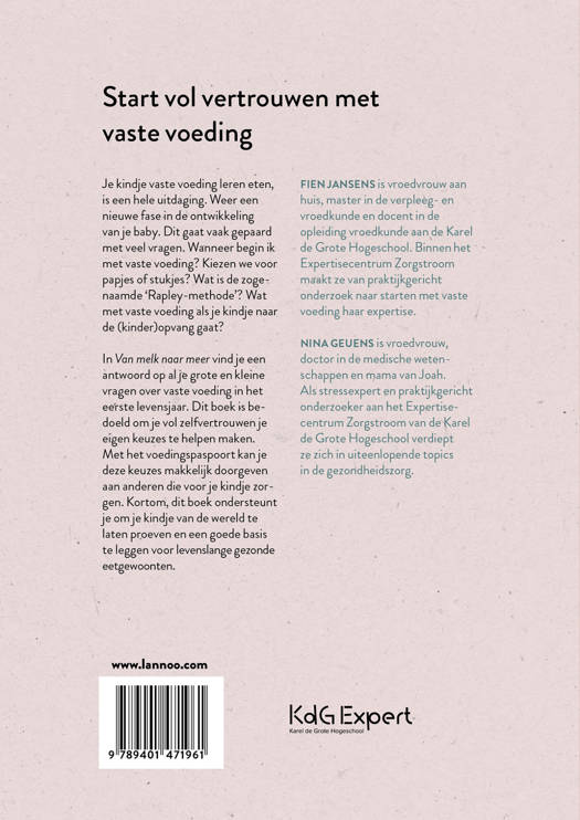 In Van melk naar meer vind je een antwoord op al je grote en kleine vragen over vaste voeding in het eerste levensjaar. Dit boek is bedoeld om je vol zelfvertrouwen je eigen keuzes te helpen maken. Met het voedingspaspoort kan je deze keuzes makkelijk doorgeven aan anderen die voor je kindje zorgen. Kortom, dit boek ondersteunt je om je kindje van de wereld te laten proeven en een goede basis te leggen voor levenslange gezonde eetgewoonten.