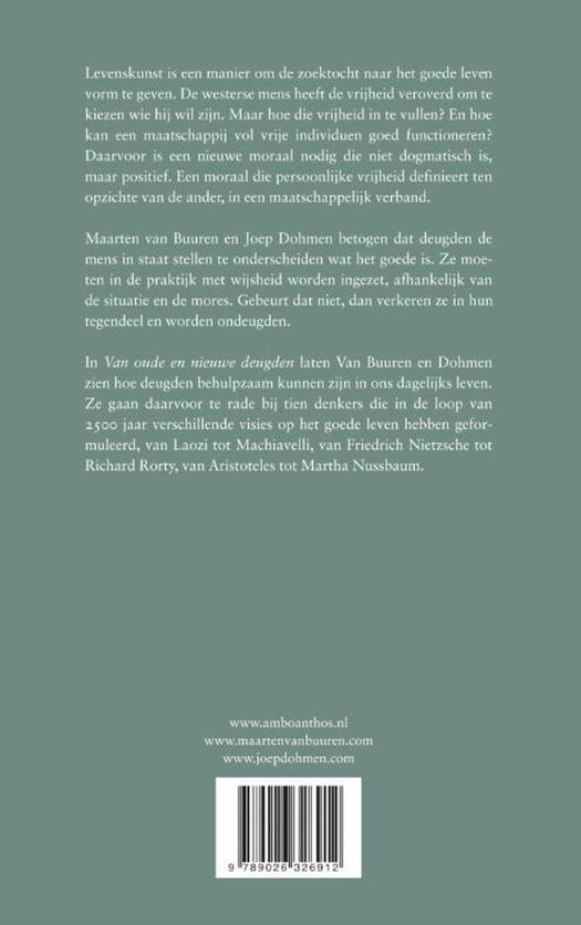 Levenskunst is een manier om de zoektocht naar het goede leven vorm te geven. De westerse mens heeft de vrijheid veroverd om te kiezen wie hij wil zijn. Maar hoe die vrijheid in te vullen? En hoe kan een maatschappij vol vrije individuen goed functioneren? Daarvoor is een nieuwe moraal nodig die niet dogmatisch is, maar positief. Een moraal die persoonlijke vrijheid definieert ten opzichte van de ander, in een maatschappelijk verband. Maarten van Buuren en Joep Dohmen betogen dat deugden de mens in staat stellen te onderscheiden wat het goede is. Ze moeten in de praktijk met wijsheid worden ingezet, afhankelijk van de situatie en de mores. Gebeurt dat niet dan verkeren ze in hun tegendeel en worden ondeugden. In 'Van oude en nieuwe deugden' gaan Van Buuren en Dohmen te rade bij tien denkers die in de loop van 2500 jaar verschillende visies op het goede leven hebben geformuleerd, van Laozi tot Machiavelli, van Friedrich Nietzsche tot Richard Rorty, van Aristoteles tot Martha Nussbaum.