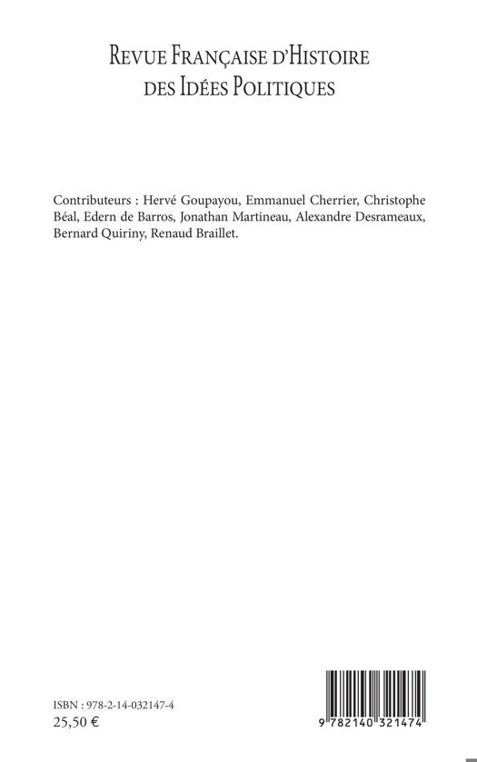 Au sommaire : Justice et égalité des genres dans la République de Platon / Naissance d'une notion : le coup d'Etat / William Godwin et l'abolitionnisme pénal / Les "contes de fée" chinois des économistes physiocrates / Les connexions globales de la théorie stadiale de l'histoire La temporalisation de la différence dans les Lumières françaises et écossaises du milieu du XVIIIe siècle / Nos victimes ou l'infinie recherche du juste milieu dans les rapports entre homme et bête / Léon Duguit ou le comtisme des juristes / La règle verte : redessiner le paysage politique par des bornes écologiques et juridiques