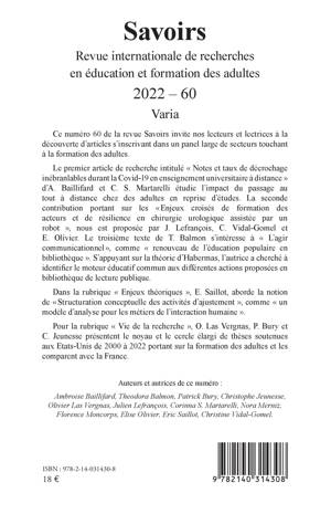 Ce numéro 60 de la revue Savoirs invite nos lecteurs et lectrices à la découverte d'articles s'inscrivant dans un panel large de secteurs touchant à la formation des adultes. Le premier article de recherche intitulé Notes et taux de décrochage inébranlables durant la Covid-19 en enseignement universitaire à distance d'A. Baillifard et C. S. Martarelli étudie l'impact du passage au tout à distance chez des adultes en reprise d'études. La seconde contribution portant sur les Enjeux croisés de formation des acteurs et de résilience en chirurgie urologique assistée par un robot, nous est proposée par J. Lefrançois, C. Vidal-Gomel et E. Olivier. Le troisième texte de T. Balmon s'intéresse à L'agir communicationnel, comme renouveau de l'éducation populaire en bibliothèque . S'appuyant sur la théorie d'Habermas, l'autrice a cherché à identifier le moteur éducatif commun aux différentes actions proposées en bibliothèque de lecture publique.