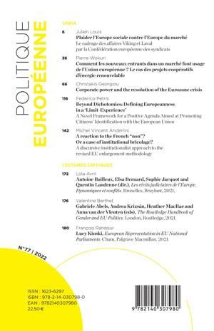 Varia 6 Julien Louis Plaider l'Europe sociale contre l'Europe du marché Le cadrage des affaires Viking et Laval par la Confédération européenne des syndicats 36 Pierre Wokuri Comment les nouveaux entrants dans un marché font usage de l'Union européenne ? Le cas des projets coopératifs d'énergie renouvelable 66 Christakis Georgiou Corporate power and the resolution of the Eurozone crisis 116 Federico Petris Beyond Dichotomies: Defining Europeanness in a 'Limit-Experience' A Novel Framework for a Positive Agenda Aimed at Promoting Citizens' Identification with the European Union 142 Michel Vincent Anderlini A reaction to the French "non"? Or a case of institutional bricolage? A discursive institutionalist approach to the revised EU enlargement methodology LECTURES CRITIQUES 172 Lola Avril Antoine Bailleux, Elsa Bernard, Sophie Jacquot and Quentin Landenne (dir.), Les récits judiciaires de l'Europe. Dynamiques et conflits, Bruxelles, Bruylant, 2021. 176 Valentine Berthet Gabriele Abels, Andrea Krizsán, Heather MacRae and Anna van der Vleuten (eds), The Routledge Handbook of Gender and EU Politics, London, Routledge, 2021. 180 François Randour Lucy Kinski, European Representation in EU National Parliaments, Cham, Palgrave Macmillan, 2021.