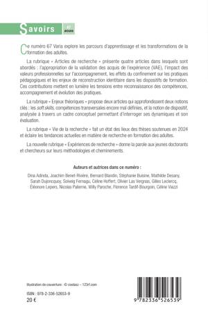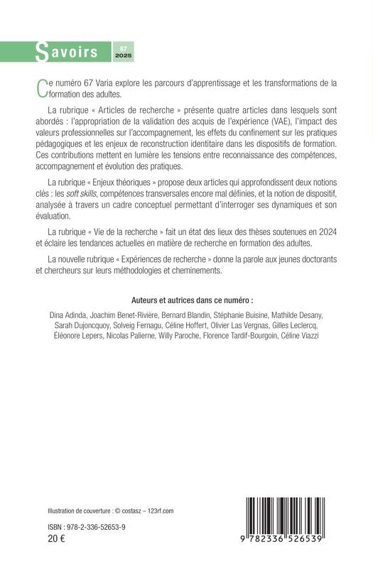 Ce numéro 67 Varia explore les parcours d'apprentissage et les transformations de la formation des adultes. La rubrique Articles de recherche présente quatre articles dans lesquels sont abordés: l'appropriation de la validation des acquis de l'expérience (VAE), l'impact des valeurs professionnelles sur l'accompagnement, les effets du confinement sur les pratiques pédagogiques et les enjeux de reconstruction identitaire dans les dispositifs de formation. Ces contributions mettent en lumière les tensions entre reconnaissance des compétences, accompagnement et évolution des pratiques. La rubrique Enjeux théoriques propose deux articles qui approfondissent deux notions clés: les soft skills, compétences transversales encore mal définies, et la notion de dispositif, analysée à travers un cadre conceptuel permettant d'interroger ses dynamiques et son évaluation. La rubrique Vie de la recherche fait un état des lieux des thèses soutenues en 2024 et éclaire les tendances actuelles en matière de recherche en formation des adultes. La nouvelle rubrique Expériences de recherche donne la parole aux jeunes doctorants et chercheurs sur leurs méthodologies et cheminements.