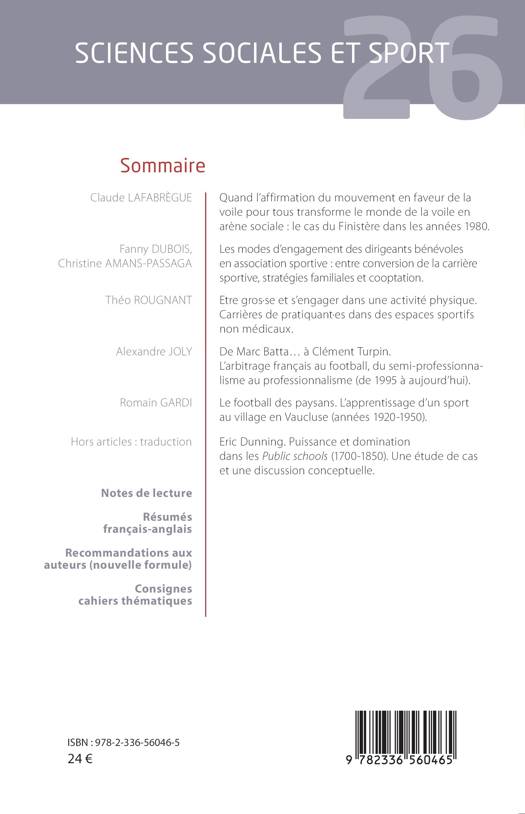 Quand l'affirmation du mouvement en faveur de la voile pour tous transforme le monde de la voile en arène sociale: le cas du Finistère dans les années 1980; Les modes d'engagement des dirigeants bénévoles en association sportive: entre conversion de la carrière sportive, stratégies familiales et cooptation; Etre gros-se et s'engager dans une activité physique. Carrières de pratiquant-es dans des espaces sportifs non médicaux; De Marc Batta... à Clément Turpin. L'arbitrage français au football, du semi-professionnalisme au professionnalisme (de 1995 à aujourd'hui); Le football des paysans. L'apprentissage d'un sport au village en Vaucluse (années 1920-1950); Puissance et domination dans les Public schools (1700-1850). Une étude de cas et une discussion conceptuelle.