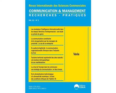 Editorial 1/Les stratégies d'intelligence informationnelle dans les réseaux féminins d'entrepreneuriat : une étude au prisme du genre. 2/ La communication constitutive de la réorganisation par les managers de proximité. Le cas de co-entreprise. 3/ En quête de légitimité : la communication organisationnelle d'Amazon dans l'industrie du livre. 4/ Tourisme territorial expérientiel des sites naturels : une analyse netnograhique de ces manifestations. 5/ La crise de l'énergie dans les communes : une stratégie de communication en deux temps. 6/ De la domestication technologique à la domesticité numérique : le futur des conditions éthiques de l'habiter (II)