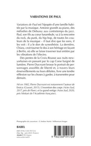 Après "L'invention des corps" et "Le grand vertige", toujours en phase avec les vibrations du monde, Pierre Ducrozet change de focale pour raconter une famille dont l'astre vital est la musique, une famille où l'amour (et les malentendus) circulent dans toutes les tonalités. Où l'on retrouve son énergie, sa plasticité, sa vitesse au service d'une profondeur nouvelle dans une anti- saga affranchie des modèles, une histoire intime, sauvage et informelle de la musique au XXe siècle, un roman qui danse et qui sonne comme un concert et une tempête. Au plus près des personnages, dans l'exploration de ce qui les lie et les délie, "Variations de Paul" nous happe et nous bouleverse.