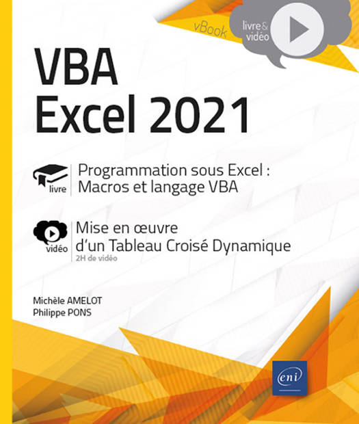 Ce livre de la collection vBook se compose d'un livre de référence sur VBA Excel 2021 pour programmer sous Excel avec les macros et le langage VBA et d’un approfondissement sous forme de vidéo sur la programmation d’une application Excel mettant en œuvre un Tableau Croisé Dynamique.
