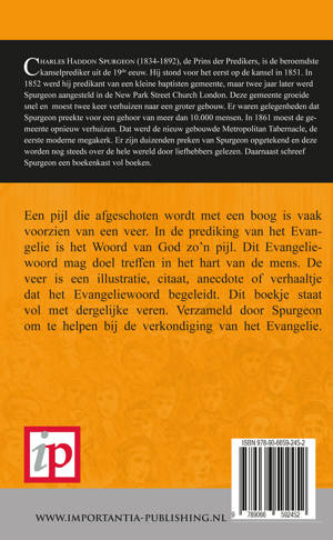 Een pijl die afgeschoten wordt met een boog is vaak voorzien van een veer. In de prediking van het Evangelie is het Woord van God zo'n pijl. Dit Evangeliewoord mag doel treffen in het hart van de mens. De veer is een illustratie, citaat, anecdote of verhaaltje dat het Evangeliewoord begeleidt. Dit boekje staat vol met dergelijke veren. Verzameld door Spurgeon om te helpen bij de verkondiging van het Evangelie.