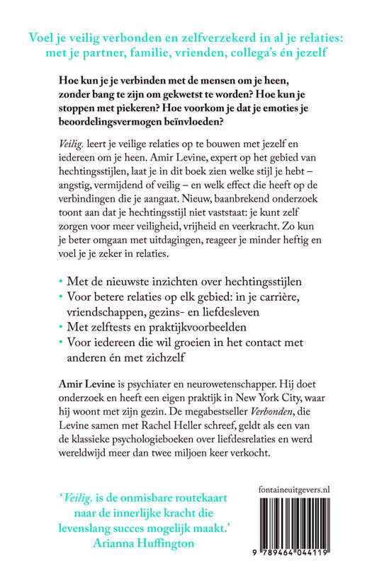 Veilig. laat zien hoe we ons succesvol kunnen verbinden en zeker kunnen voelen in relaties. Amir Levine, auteur van de megabestseller Verbonden, leert ons op basis van de nieuwste inzichten over hechtingsstijlen en met behulp van praktische tools als vragenlijsten en quizzen veilige relaties op te bouwen met iederéén om ons heen, inclusief onszelf. Je ontdekt welke hechtingsstijl je hebt – angstig, vermijdend of veilig – en welk effect die heeft op je relaties. Door je brein te beïnvloeden kun je zelf zorgen voor meer veiligheid en vrijheid. Voor iedereen die wil groeien in het contact met anderen én met zichzelf.