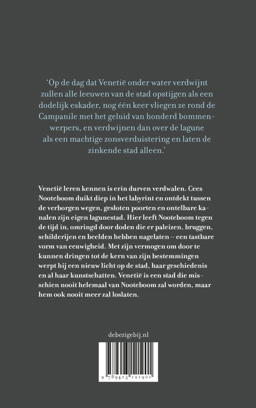 Je leert een stad pas echt kennen als je in de straten en stegen ervan verdwaalt. Venetië, met al haar verstopte hoeken en gesloten poorten, omringd door de ontelbare lagunes, is gemaakt om de weg in kwijt te raken. Maar, zo weet de echte reiziger: de weg kwijtraken betekent het vinden van het mooiste wat een plek te bieden heeft. Cees Nooteboom is zo’n echte reiziger. Hij zoekt zijn weg langs gebeeldhouwde bogen en dobberende gondels en neemt de lezer mee achter het toeristische masker van de stad van het water. Vanaf de voorplecht van een vaporetto laat hij leven en kunst aan zich voorbijglijden.