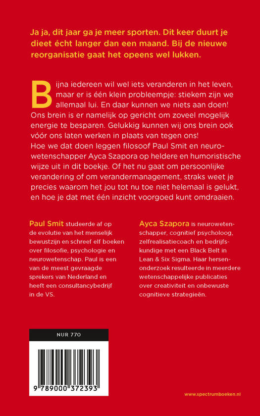 Gelukkig kunnen wij ons brein ook voor ons laten werken in plaats van tegen ons! Dat leggen neurowetenschapper (en expert op het gebied van verandering) Ayca Szapora en filosoof (en meest gevraagde spreker van het land) Paul Smit op heldere en humoristische wijze uit in dit boekje. Of het nu gaat om persoonlijke verandering of om verandermanagement, straks weet je precies waarom het jou tot nu niet helemaal is gelukt, en hoe je dat met één inzicht voorgoed om kunt draaien.