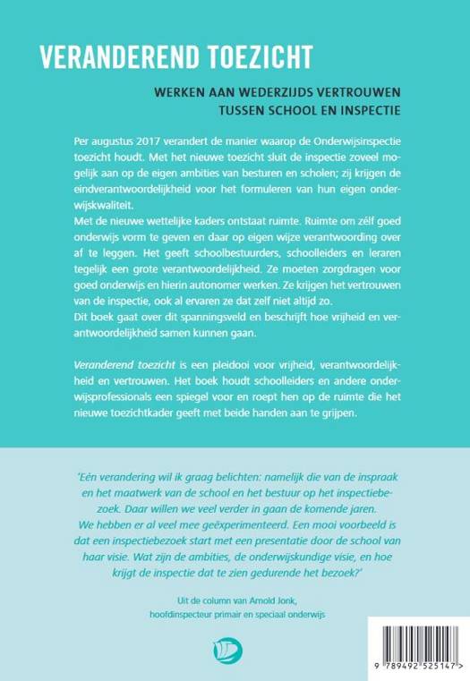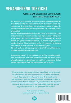 Veranderend toezicht is een pleidooi voor vrijheid, verantwoordelijkheid en vertrouwen. Het boek houdt schoolleiders en andere onderwijsprofessionals een spiegel voor en roept hen op de ruimte die het nieuwe toezichtkader geeft met beide handen aan te grijpen.
