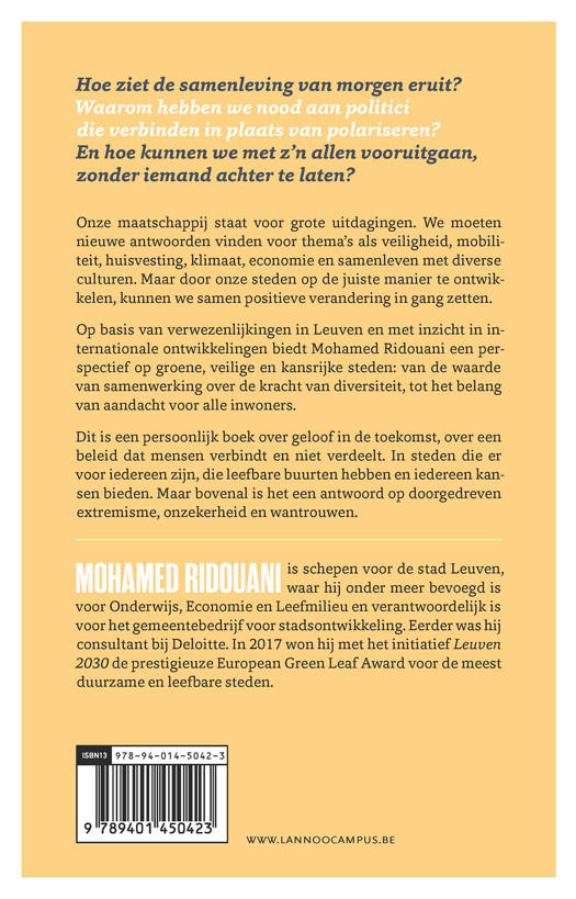 Hoe ziet de samenleving van morgen eruit? Waarom hebben we nood aan politici die verbinden in plaats van polariseren? En hoe kunnen we met z'n allen vooruitgaan, zonder iemand achter te laten? Onze maatschappij staat voor grote uitdagingen. We moeten nieuwe antwoorden vinden voor thema's als veiligheid, mobiliteit, huisvesting, klimaat, economie en samenleven met diverse culturen. Maar door onze steden op de juiste manier te ontwikkelen, kunnen we samen positieve verandering in gang zetten. Op basis van verwezenlijkingen in Leuven en met inzicht in internationale ontwikkelingen biedt Mohamed Ridouani een perspectief op groene, veilige en kansrijke steden: van de waarde van samenwerking over de kracht van diversiteit, tot het belang van aandacht voor alle inwoners. Dit is een persoonlijk boek over geloof in de toekomst, over een beleid dat mensen verbindt en niet verdeelt. In steden die er voor iedereen zijn, die leefbare buurten hebben en iedereen kansen bieden. Maar bovenal is het een antwoord op doorgedreven extremisme, onzekerheid en wantrouwen.