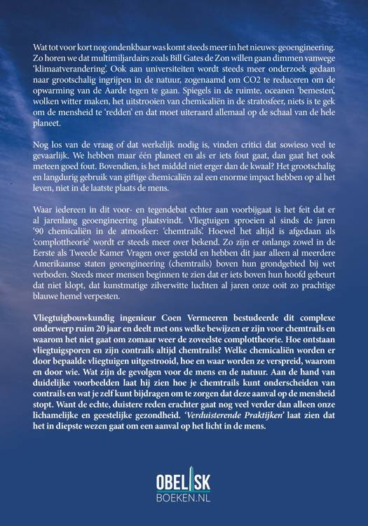 Vliegtuigbouwkundig ingenieur Coen Vermeeren bestudeerde dit complexe onderwerp ruim 20 jaar en deelt met ons welke bewijzen er zijn voor chemtrails en waarom het niet gaat om zomaar weer de zoveelste complottheorie. Hoe ontstaan vliegtuigsporen en zijn contrails altijd chemtrails? Welke chemicaliën worden er door bepaalde vliegtuigen uitgestrooid, hoe en waar worden ze verspreid, waarom en door wie. Wat zijn de gevolgen voor de mens en de natuur. Aan de hand van duidelijke voorbeelden laat hij zien hoe je chemtrails kunt onderscheiden van contrails en wat je zelf kunt bijdragen om te zorgen dat deze aanval op de mensheid stopt. Want de echte, duistere reden erachter gaat nog veel verder dan alleen onze lichamelijke en geestelijke gezondheid. 'Verduisterende Praktijken' laat zien dat het in diepste wezen gaat om een aanval op het licht in de mens.