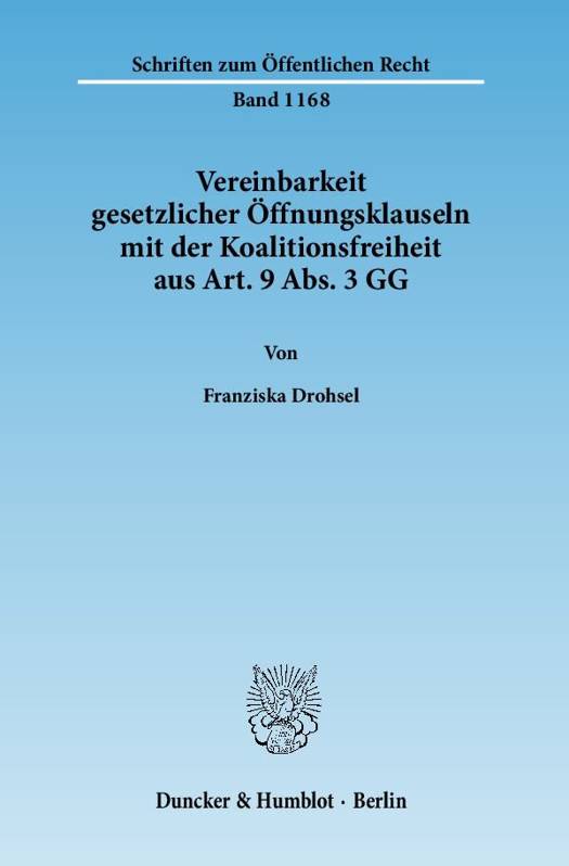 In dieser rechtswissenschaftlichen Arbeit untersucht Franziska Drohsel eine in den letzten Jahren hoch umstrittene, arbeits- und wirtschaftspolitisch bedeutende Frage, deren Relevanz aktuell vor dem Hintergrund der Finanz- und Wirtschaftskrise eher steigen als sinken dürfte. Gegenstand der Untersuchung ist die Frage, inwieweit gesetzliche Öffnungsklauseln, d. h. betriebliche Abweichungen vom Tarifvertrag ohne Zustimmung der Tarifparteien, verfassungsrechtlich möglich sind. Diese Problematik liegt an der Schnittstelle zwischen Verfassungs- und Arbeitsrecht.