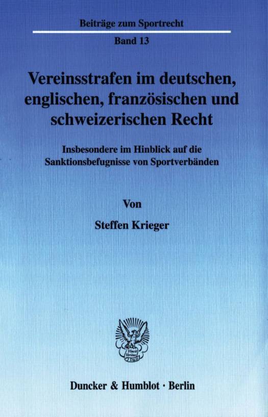 In seiner rechtsvergleichenden Arbeit untersucht der Verfasser anhand spezifischer Fragestellungen die Grenzen der Vereinsstrafe im deutschen, englischen, französischen und schweizerischen Recht. Als Ausgangspunkt dienen zwei Fallbeispiele (die Verfahren Modahl und Baumann), die im Verlauf der Untersuchung immer wieder zur Verdeutlichung aufgegriffen werden. Zunächst behandelt der Autor die Frage der Begründung der Strafgewalt von Vereinen und Verbänden. Neben der Erörterung ihrer statutorischen Herleitung und Rechtsnatur liegt ein Schwerpunkt der Untersuchung auf dem Problem der Erstreckung der Strafgewalt auf Nicht-Verbandsmitglieder, zu denen Spitzensportler in der Regel zählen.