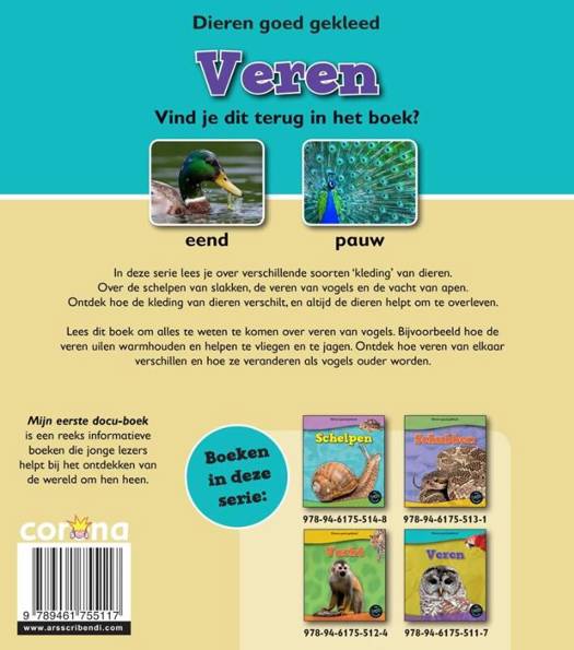 In deze serie lees je over verschillende soorten ‘kleding’ van dieren. Over de schelpen van slakken, de veren van vogels en de vacht van apen. Ontdek hoe de kleding van dieren verschilt, en altijd de dieren helpt om te overleven. Lees dit boek om alles te weten te komen over veren van vogels. Bijvoorbeeld hoe de veren uilen warmhouden en helpen te vliegen en te jagen. Ontdek hoe veren van elkaar verschillen en hoe ze veranderen als vogels ouder worden.
