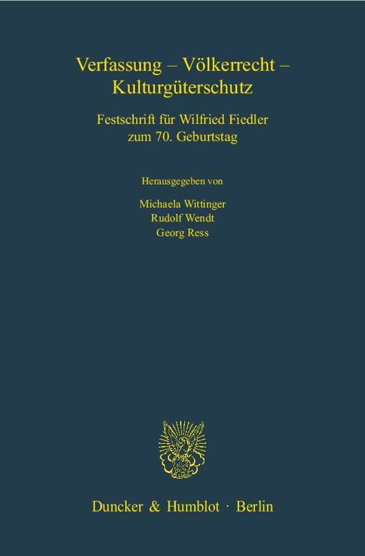 Am 22. Dezember 2010 vollendete Wilfried Fiedler sein 70. Lebensjahr. Dies ist Anlass für seine Schüler, Weggefährten, Kollegen und Freunde ihn und sein Wirken als Wissenschaftler und akademischer Lehrer mit dieser Festschrift zu würdigen und ihre Verehrung, ihren Dank und ihre Verbundenheit zu bekunden. Der Titel der Festschrift "Verfassung, Völkerrecht und Kulturgüterschutz" nimmt Bezug auf die wesentlichen Schwerpunkte im wissenschaftlichen Schaffen des Jubilars.