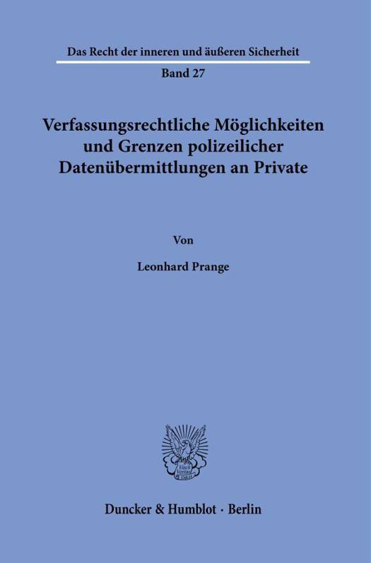 English summary: Constitutional Possibilities and Limitations of Police Data Transmissions to Private Parties The transfer of personal data to private parties by the police is of considerable relevance to the fundamental rights of the data subject, as there are hardly any instruments for controlling the further use of the transferred data. The thesis examines whether the current federal and state police laws in Germany meet the resulting constitutional requirements. German description: Die polizeiliche Ubermittlung personenbezogener Daten an Personen und Stellen ausserhalb des offentlichen Bereichs ist von erheblicher Grundrechtsrelevanz fur die Betroffenen, da unter anderem kaum Kontrollmoglichkeiten fur die weitere Verwendung der ubermittelten Daten bestehen. In der Arbeit wird daher die Frage untersucht, ob die derzeitigen bundes- und landespolizeigesetzlichen Ermachtigungsgrundlagen den sich daraus ergebenden verfassungsrechtlichen Anforderungen fur Datenubermittlungen an Private genugen. Unter Berucksichtigung der wesentlichen praktischen Anwendungsfalle werden dabei umfassender Uberarbeitungs- und Neuregelungsbedarf festgestellt und eine alternative Regelungssystematik erarbeitet. Hierzu wird auch ein vergleichender Blick auf Vorschriften im europaischen Ausland geworfen.