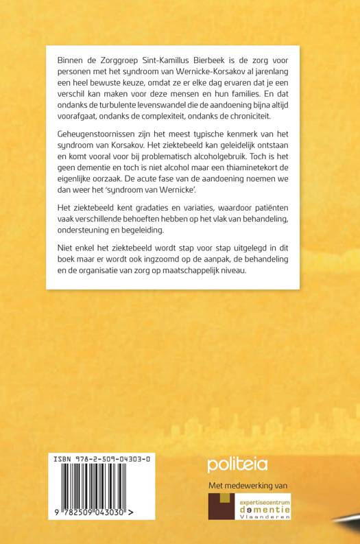 Het ziektebeeld kan geleidelijk ontstaan en komt vooral voor bij problematisch alcoholgebruik. Toch is het geen dementie en toch is niet alcohol maar een thiaminetekort de eigenlijke oorzaak. De acute fase van de aandoening noemen we dan weer het ‘syndroom van Wernicke’. Het ziektebeeld kent gradaties en variaties, waardoor patiënten vaak verschillende behoeften hebben op het vlak van behandeling, ondersteuning en begeleiding. Niet enkel het ziektebeeld wordt stap voor stap uitgelegd in dit boek maar er wordt ook ingzoomd op de aanpak, de behandeling en de organisatie van zorg op maatschappelijk niveau.