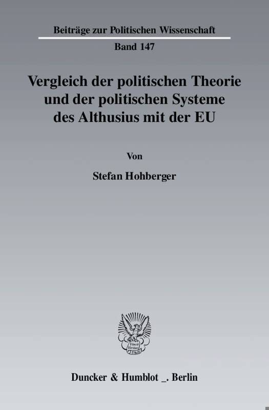 Stefan Hohberger geht durch einen systematisch-analytischen Vergleichsansatz mit der Methode der deskriptiven Analyse der Frage nach, ob eine Übertragung der Elemente der politischen Theorie (z. B. Volksvertretung) sowie des politischen Systems (z. B. Verfassung) des Johannes Althusius (dt. Jurist und Philosoph; 1557-1638) auf die der EU möglich ist und ob aus den Althusius'schen Ansätzen Erkenntnisse für die Fortentwicklung der europäischen Strukturen gewonnen werden können. Johannes Althusius wurde mit seiner"Politica Methodice Digesta"auserwählt, weil er eine für diese Zeit vollständige Rechts- und Staatstheorie auf Basis der juristischen Vertragstheorie entwickelte und erstmals bei ihm der für die EU konstituierende Begriff der Subsidiarität im Zusammenhang mit der politischen Theorie erscheint.
