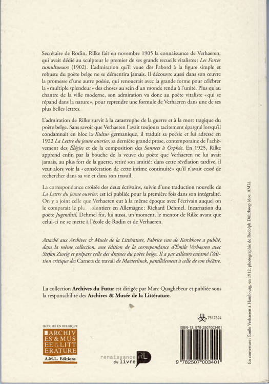 Secrétaire de Rodin, Rilke fait en novembre 1905 la connaissance de Verhaeren, qui avait dédié au sculpteur le premier de ses grands recueils vitalistes : Les Forces tumultueuses(1902). L’admiration qu’il voue dès l’abord à la figure simple et robuste du poète belge ne se démentira jamais. La correspondance croisée des deux écrivains est ici publiée pour la première fois dans son intégralité. On y a joint celle que Verhaeren entretient à la même époque avec l’écrivain auquel on le comparait le plus souvent en Allemagne: Richard Dehmel, L’incarnation du poète Jugendstil, qui fut aussi le mentor de Rilke avant que celui-ci ne se mette à l’école de Rodin.
