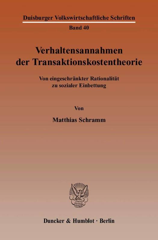 Matthias Schramm widmet sich der kritischen Analyse der Verhaltensannahmen der Transaktionskostentheorie, die stellvertretend für die Neue Institutionenökonomie auf methodologischer und theoretisch-inhaltlicher Ebene untersucht wird. Besonderes Gewicht legt er dabei auf die Rationalitätsannahme, da ihr eine besondere Bedeutung innerhalb der Theorie zukommt: Sie bezieht sich auf den Kern des Ökonomisierens selbst. Vor diesem Hintergrund schlägt er ein umfassendes Rationalitätskonzept vor, das neben kognitiven Restriktionen auch die soziale Einbindung der Akteure in die Institutionen ihres sozialen und kulturellen Umfeldes mit beachtet. Letztlich zeigt sich, dass die sozio-kulturelle Einbettung die Denk- und Handlungsmuster und auch die Informationswahrnehmung und -verarbeitung entscheidend determiniert.