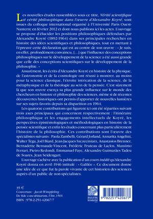 Les nouvelles etudes rassemblees sous ce titre, Verite scientifique et verite philosophique dans l'oeuvre d'Alexandre Koyre, sont issues du colloque international organise a l'Universite Paris Ouest-Nanterre en fevrier 2012 et dont nous publions ici les actes. L'ouvrage se propose d'elucider les positions philosophiques defendues par Alexandre Koyre (1892-1964) dans ses principales recherches en histoire des idees scientifiques et philosophiques, tout en mettant a l'epreuve cette declaration qui est au centre de son oeuvre: Je suis, en effet, profondement convaincu, [...] que l'influence des conceptions philosophiques sur le developpement de la science a ete aussi grande que celle des conceptions scientifiques sur le developpement de la philosophie. Assurement, les ecrits d'Alexandre Koyre en histoire de la physique, de l'astronomie et de la cosmologie ont reussi a montrer, au moins pour la science classique, l'etroite intrication de la science, de la metaphysique et de la theologie au sein de la pensee. C'est surement la que son oeuvre exerca sa plus grande influence sur le monde des chercheurs en histoire et philosophie des sciences, meme si de recentes decouvertes historiques ont permis d'apporter de nouvelles lumieres sur ses sujets favoris depuis sa disparition en 1964. Les quatorze contributions qui figurent ici ont ete reparties suivant trois axes principaux qui concernent respectivement: l'itineraire philosophique et les engagements intellectuels de Koyre, les perspectives epistemologiques et methodologiques en histoire de la pensee scientifique et enfin les etudes concernant plus particulierement l'histoire de la philosophie. Ces contributions sont l'oeuvre des specialistes suivants: Paola Zambelli, Gerard Jorland, Annarita Angelini, Walter Tega, Joel Biard, Jean-Jacques Szczeciniarz, Anastasios Brenner, Bernadette Bensaude-Vincent, Frederic Fruteau de Laclos, Massimo Ferrari, Pietro Redondi, Emmanuel Faye, Alexandre Guimaraes Tadeu de Soares, Jean Seidengart. L'ouvrage s'acheve avec la publication d'un cours inedit qu'Alexandre Koyre donna en avril 1946 intitule: Galilee . Ce document donne une idee de ce que fut la parole vivante de cet historien des sciences aupres d'un public de non-specialistes.