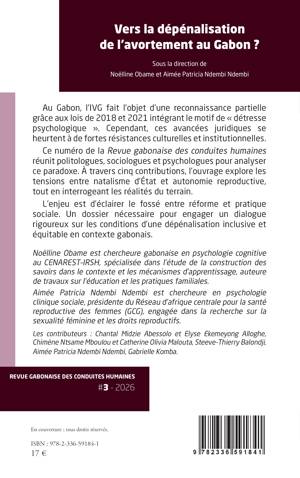 Au Gabon, l'IVG fait l'objet d'une reconnaissance partielle grâce aux lois de 2018 et 2021 intégrant le motif de détresse psychologique . Cependant, ces avancées juridiques se heurtent à de fortes résistances culturelles et institutionnelles. Ce numéro de la Revue gabonaise des conduites humaines réunit politologues, sociologues et psychologues pour analyser ce paradoxe. À travers cinq contributions, l'ouvrage explore les tensions entre natalisme d'État et autonomie reproductive, tout en interrogeant les réalités du terrain. L'enjeu est d'éclairer le fossé entre réforme et pratique sociale. Un dossier nécessaire pour engager un dialogue rigoureux sur les conditions d'une dépénalisation inclusive et équitable en contexte gabonais.