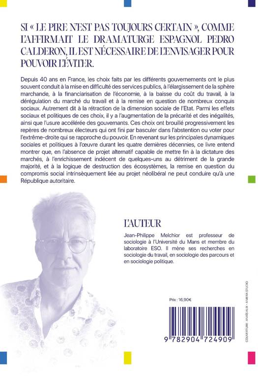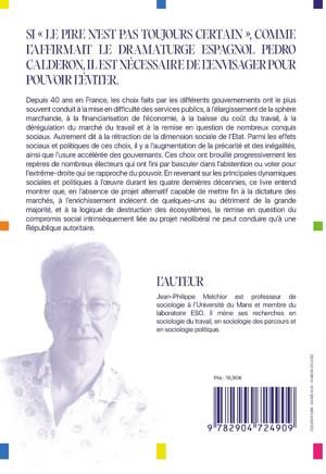 Depuis 40 ans en France, les choix faits par les différents gouvernements ont le plus souvent conduit à la mise en difficulté des services publics, à l'élargissement de la sphère marchande, à la financiarisation de l'économie, à la baisse du coût du travail, à la dérégulation du marché du travail et à la remise en question de nombreux conquis sociaux. Autrement dit à la rétraction de la dimension sociale de l'État. Parmi les effets sociaux et politiques de ces choix, il y a l'augmentation de la précarité et des inégalités, ainsi que l'usure accélérée des gouvernants. Ces choix ont brouillé progressivement les repères de nombreux électeurs qui ont fini par basculer dans l'abstention ou voter pour l'extrême-droite qui se rapproche du pouvoir. En revenant sur les principales dynamiques sociales et politiques à l'oeuvre durant les quatre dernières décennies, ce livre entend montrer que, en l'absence de projet alternatif capable de mettre fin à la dictature des marchés, à l'enrichissement indécent de quelques uns au détriment de la grande majorité, et à la logique de destruction des écosystèmes, la emise en question du compromis social intrinsèquement liée au projet néolibéral ne peut conduire qu'à une République autoritaire.
