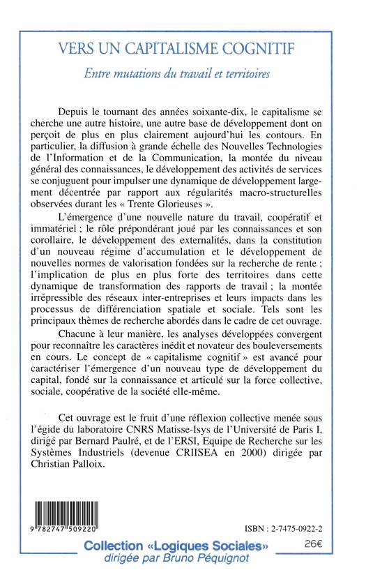 Depuis les années 70, le développement du capitalisme a connu un tournant. La diffusion à grande échelle des Nouvelles Technologies de l'Information et de la Communication, la montée du niveau général des connaissances, le développement des activités de services se conjuguent pour impulser une dynamique de développement largement décentrée par rapport aux régularités macro-structurelles observées durant les "Trente Glorieuses ". Le concept de " capitalisme cognitif " reflète l'émergence d'un nouveau type de développement du capital, fondé sur la connaissance et articulé sur la force collective sociale, coopérative de la société.