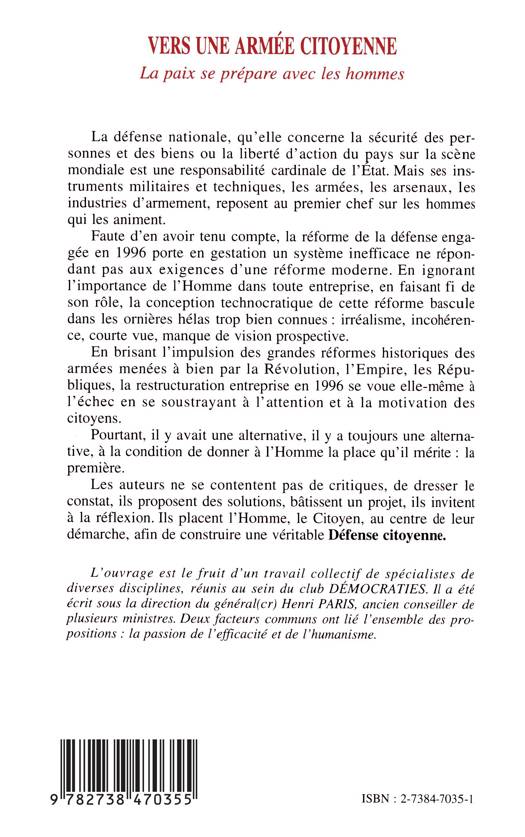 La défense nationale est une responsabilité cardinale de l'Etat. Mais ses instruments militaires et techniques, les années, les arsenaux, les industries d'armement, reposent au premier chef sur les hommes qui les animent. Faute d'en avoir tenu compte, la réforme engagée en 1996 porte en gestation un système inefficace ne répondant pas aux exigences d'une réforme moderne. Les auteurs de ce livre ne se contentent pas de critiquer, de dresser le constat, ils proposent des solutions, bâtissent un projet. Ils placent l'Homme, le Citoyen, au centre de leur démarche, afin de construire une véritable Défense citoyenne.