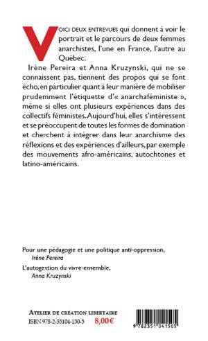 Irène Pereira et Anna Kruzynski, qui ne se connaissent pas, tiennent des propos qui se font écho, en particulier quant à leur manière de mobiliser prudemment l’étiquette d’« anarchaféministe », même si elles ont plusieurs expériences dans des collectifs féministes. Aujourd’hui, elles s’intéressent et se préoccupent de toutes les formes de domination et cherchent à intégrer dans leur anarchisme des réflexions et des expériences d’ailleurs, par exemple des mouvements afro-américains, autochtones et latino-américains.