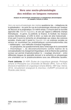 Cet ouvrage questionne les "métaphores de la globalisation" du point de vue de la phraséologie informée par l'analyse de discours et la pragmatique. En même temps, il s'inscrit dans la nouvelle approche dite Internet linguistics, et ceci par rapport à différents champs thématiques: le genre, la publicité, la finance, le football, les réseaux sociaux et le droit. La visée est transversale: d'une part il ouvre la recherche en phraséologie aux enjeux des sciences sociales, d'autre part il prend le linguistic turn en sciences sociales au sérieux en soumettant les problématiques communicationnelles des "médiascapes" aux méthodes d'analyse linguistique.
