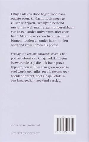 Chaja Polak verloor begin 2006 haar oudste zoon. Door het verlies van haar kind dacht ze nooit meer te zullen schrijven, 'schrijven bestond misschien wel, maar ergens onbereikbaar ver, in een ander universum, niet voor haar.' Maar de woorden lieten zich niet binnen houden en onder haar handen ontstond zowel proza als poëzie. Verslag van een onaanvaarde dood is het poëziedebuut van Chaja Polak. In een bezwerende stijl die ook haar proza typeert, een stijl waarin geen woord te veel wordt gebruikt, en die tevens zeer beeldend werkt, doet Chaja Polak in een lang gedicht zoekend verslag.