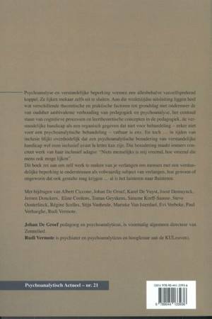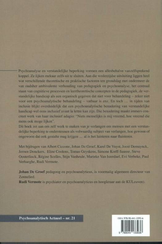 Psychoanalyse en verstandelijke beperking vormen een allesbehalve vanzelfsprekend koppel. Ze lijken mekaar zelfs uit te sluiten. Aan die wederzijdse uitsluiting liggen heel wat verschillende theoretische en praktische factoren ten grondslag met ondermeer de van oudsher ambivalente verhouding van pedagogiek en psychoanalyse, het centraal staan van cognitieve processen en leertheoretische concepten in de pedagogiek, de verstandelijke handicap als een organisch gegeven dat niet voor behandeling – zeker niet voor een psychoanalytische behandeling – vatbaar is enz. En toch … in tijden van inclusie blijkt overduidelijk dat een psychoanalytische benadering van verstandelijke handicap wel eens inclusief avant la lettre kan zijn. Die benadering maakt immers concreet werk van haar inclusief adagio: “Niets menselijks is mij vreemd, hoe vreemd die mens ook moge lijken”. Dit boek zet aan om zelf werk te maken van je verlangen om mensen met een verstandelijke beperking te ondersteunen als volwaardig subject van verlangen, hoe gewoon of ongewoon dat ook gestalte mag krijgen ... al is het luisteren naar fluisteren.