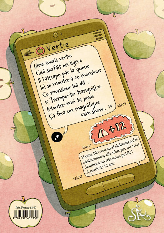 Une souris vert·e // Qui surfait en lign·e // Il l’attrape par la queue // Iel se montre à ce monsieur // Ce monsieur lui dit : // « Trempe-toi tranquill·e // Montre-moi ta peau // Ça fera un magnifique cam show… » Si cette BD veut aussi s’adresser à des adolescent·e·s, elle n’est pas du tout destinée à un très jeune public ! À partir de 12 ans.