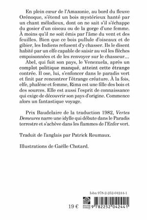 En plein coeur de l'Amazonie, au bord du fleuve Orenoque, s'etend un bois mysterieux hante par un chant melodieux, dont on ne sait s'il s'echappe du gosier d'un oiseau ou de la gorge d'une femme. A moins qu'il ne soit emis par l'ame du vent et des feuilles. Bien que ce bois pullule d'oiseaux et de gibier, les Indiens refusent d'y chasser. Ils le disent habite par un elfe capable de saisir au vol les fleches empoisonnees et de les renvoyer sur le chasseur Abel, qui fuit son pays, le Venezuela, apres un complot politique manque, atteint cette etrange contree. Il ose, lui, s'enfoncer dans le paradis vert et finit par rencontrer l'etrange creature. A la fois, elfe, phalene et femme, Rima est une fille des bois et des sources. Elle est aussi l'esprit de connaissance qui exige de decouvrir son pays d'origine. Commence alors un fantastique voyage. Prix Baudelaire de la traduction 1982, Vertes Demeures narre une idylle qui debute dans le Paradis terrestre et s'acheve dans les flammes de l'Enfer vert.