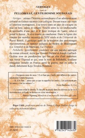 Cet ouvrage est composé de deux récits africains: « Vertiges », publié en 1943, retrace l'histoire d'un administrateur colonial en Guinée. Devant tracer une route dans les montagnes, il se retrouve dans un pays où tout est luxe, calme et volupté. Tiraillé entre une vie d'intellectuel et ses désirs érotiques, le rêve tourne alors vite au cauchemar. Le deuxième récit, « Pellobellé, gentilhomme soudanais », est une parodie satirique du roman colonial.