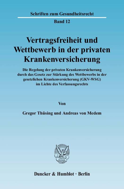 Schon während des Gesetzgebungsverfahrens waren die Änderungen rechtlich heftig umstritten. Gregor Thüsing und Andreas von Medem zeigen, dass das Reformwerk nicht mit den Grundrechten der Versicherungsunternehmen und der privat Versicherten vereinbar ist. Ihre Abhandlung beruht auf Verfassungsbeschwerden, die von 24 PKV-Unternehmen eingelegt wurden und über die das Bundesverfassungsgericht voraussichtlich Ende 2008 / Anfang 2009 entscheiden wird.