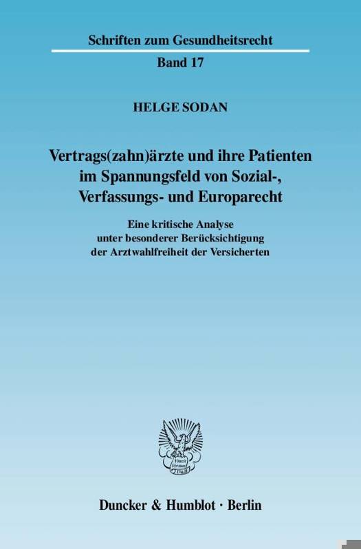Während bislang in Abhandlungen zur gesetzlichen Krankenversicherung meist speziell Rechtspositionen von Vertrags(zahn)ärzten wissenschaftlich thematisiert wurden, geht es der vorliegenden Schrift darum aufzuzeigen, wie eng Probleme des Vertrags(zahn)arztrechts mit rechtlich geschützten Interessen betroffener Patienten verknüpft sind. Die Arbeit untersucht daher das für Vertrags(zahn)ärzte und ihre Patienten bestehende Spannungsfeld von Sozial-, Verfassungs- und Europarecht. Einen Schwerpunkt bilden dabei Erörterungen der Frage, ob das bestehende sozialrechtliche Regelwerk die verfassungsrechtlichen Vorgaben für die Freiheit der Arztwahl hinreichend beachtet und gegebenenfalls eine verfassungskonforme Auslegung der einschlägigen Vorschriften möglich sowie geboten ist.