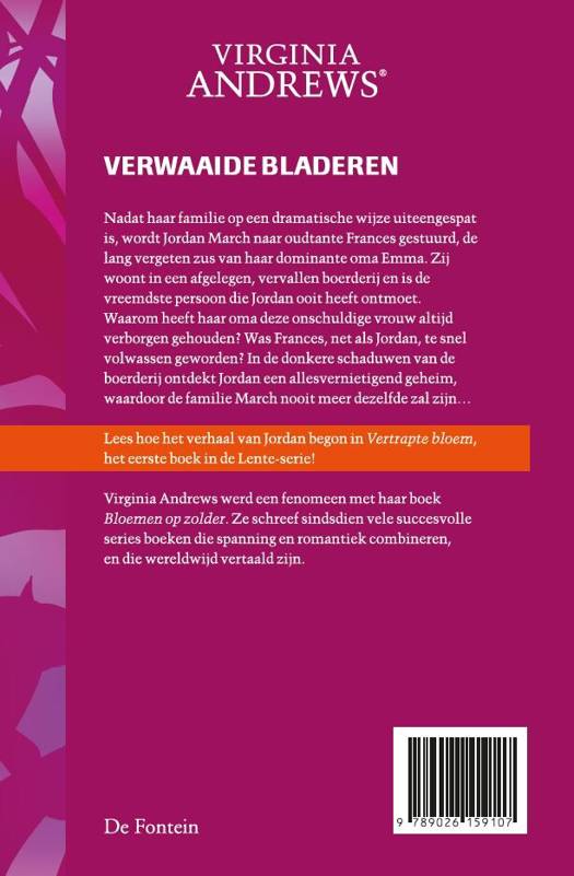 'Verwaaide bladeren' is het tweede en laatste deel in de Lente-serie van Virginia Andrews. Nadat haar familie op een dramatische wijze uiteengespat is, wordt Jordan March naar oudtante Frances gestuurd, de lang vergeten zus van haar dominante oma Emma. Zij woont in een afgelegen, vervallen boerderij en is de vreemdste persoon die Jordan ooit heeft ontmoet. Waarom heeft haar oma deze onschuldige vrouw altijd verborgen gehouden? Was Frances, net als Jordan, te snel volwassen geworden? In de donkere schaduwen van de boerderij ontdekt Jordan een allesvernietigend geheim, waardoor de familie March nooit meer dezelfde zal zijn… Lees hoe het verhaal van Jordan begon in Vertrapte bloem, het eerste boek in de Lente-serie!