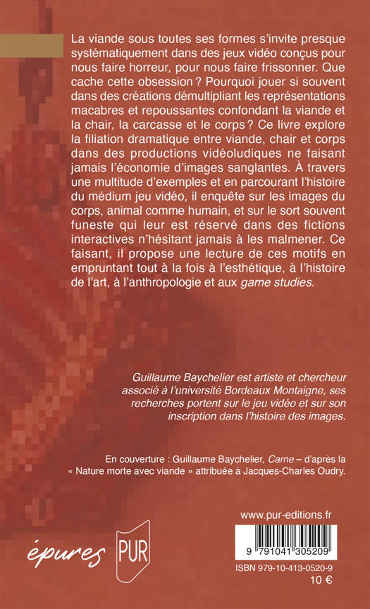 La viande sous toutes ses formes s’invite presque systématiquement dans des jeux vidéo conçus pour nous faire horreur, pour nous faire frissonner. Que cache cette obsession ? Pourquoi jouer si souvent dans des créations démultipliant les représentations macabres et repoussantes confondant la viande et la chair, la carcasse et le corps ? Ce livre explore la filiation dramatique entre viande, chair et corps dans des productions vidéoludiques ne faisant jamais l’économie d’images sanglantes. À travers une multitude d’exemples et en parcourant l’histoire du médium jeu vidéo, il enquête sur les images du corps, animal comme humain, et sur le sort souvent funeste qui leur est réservé dans des fictions interactives n’hésitant jamais à les malmener. Ce faisant, il propose une lecture de ces motifs en empruntant tout à la fois à l’esthétique, à l’histoire de l’art, à l’anthropologie et aux game studies.